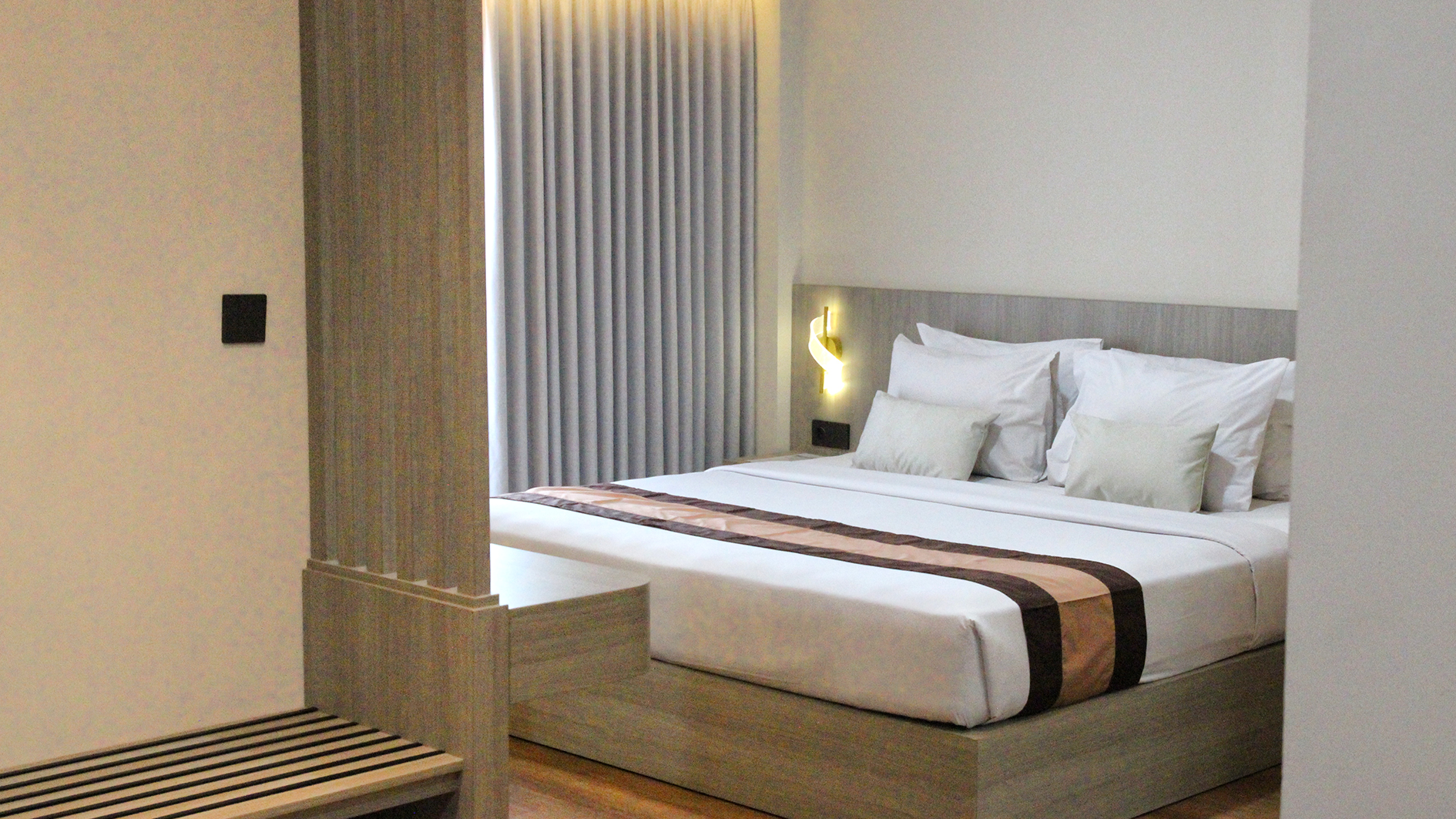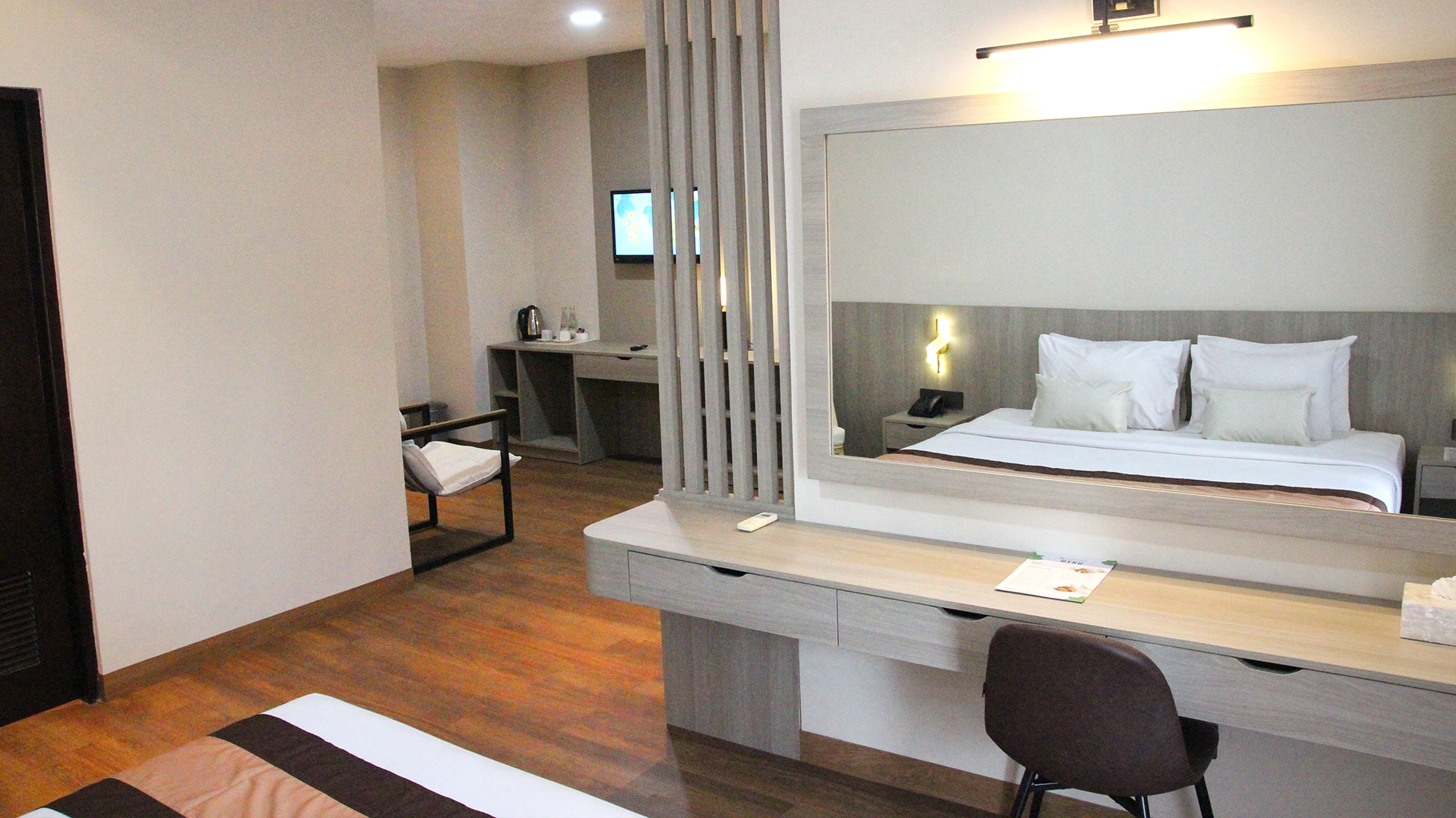 Suite Deluxe dirancang bagi mereka yang menginginkan ruang lebih luas dan kenyamanan maksimal selama menginap. Kamar ini dilengkapi tempat tidur queen yang nyaman, ruang makan, dan pemandangan kota. Fasilitas modern seperti AC, TV layar datar, Wi-Fi gratis, kulkas, serta pembuat teh dan kopi tersedia untuk memenuhi kebutuhan Anda.