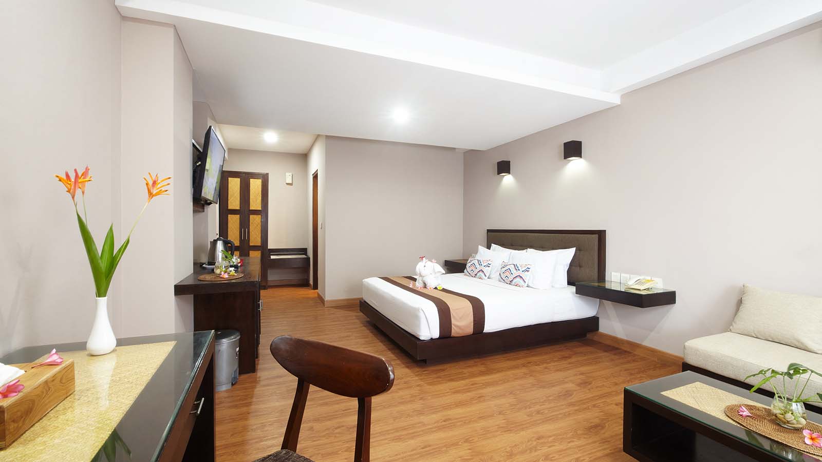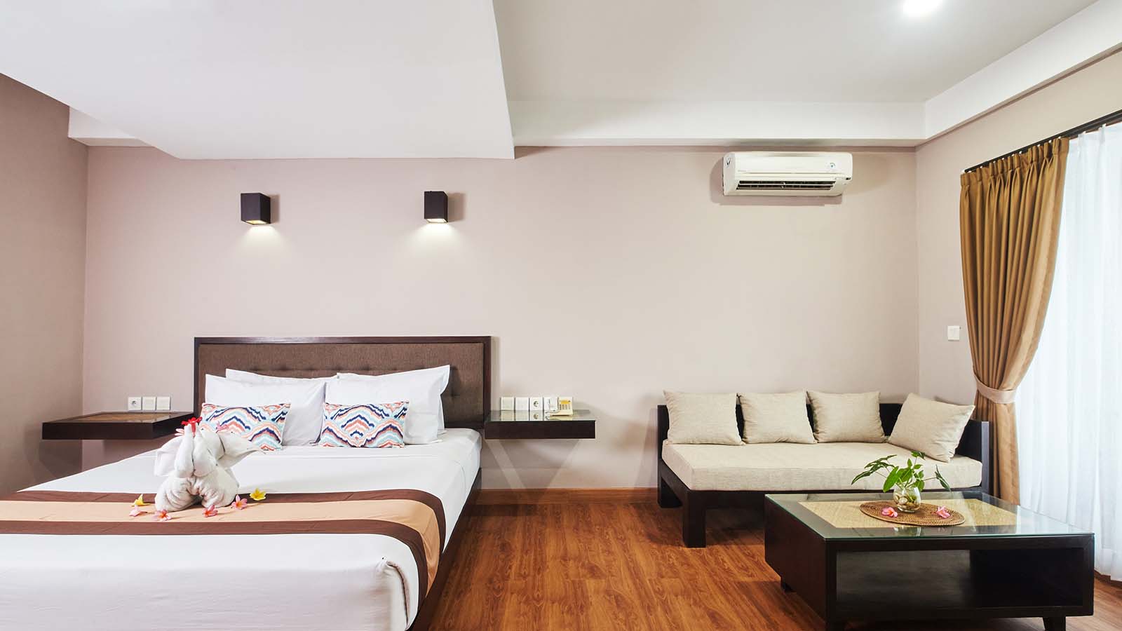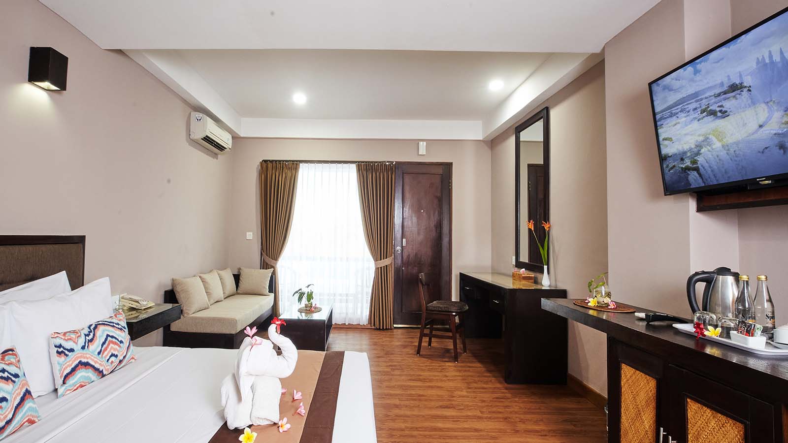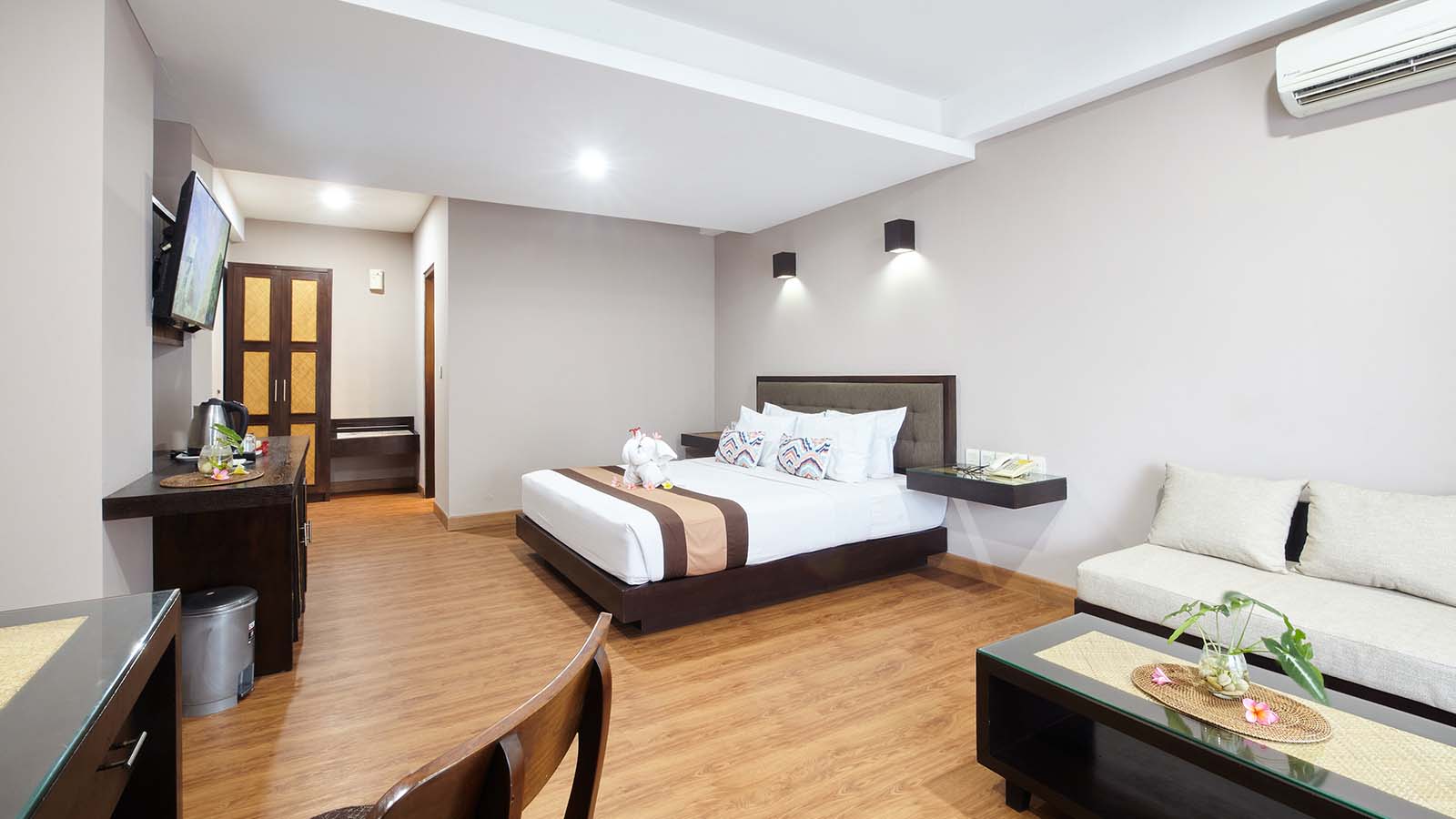 Junior Suite menawarkan lebih banyak ruang dan kenyamanan ekstra bagi mereka yang mencari masa inap yang tenang dan mewah. Kamar ini dilengkapi tempat tidur queen yang nyaman, area tempat duduk untuk bersantai, balkon pribadi dengan pemandangan kota atau kolam renang, serta fasilitas lengkap seperti AC, TV layar datar, Wi-Fi gratis, kulkas, dan pembuat teh/kopi. Kamar mandi modern dengan bathtub atau shower dan perlengkapan mandi lengkap memastikan masa inap yang nyaman.