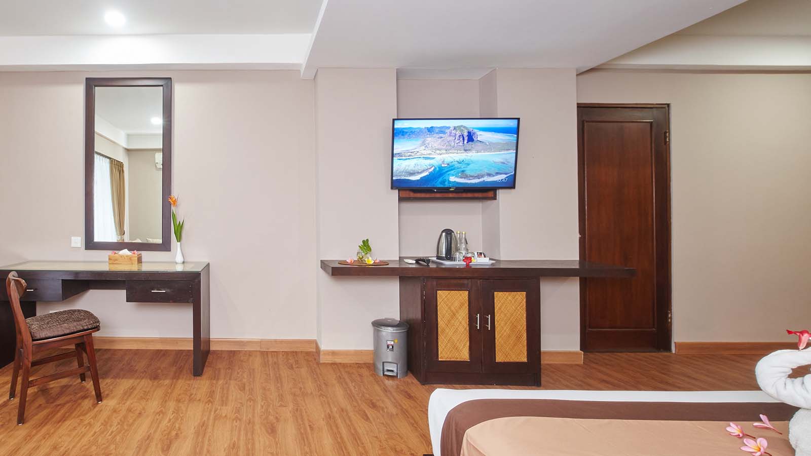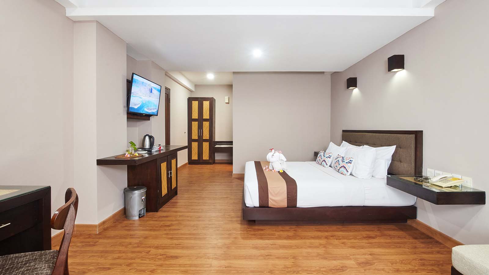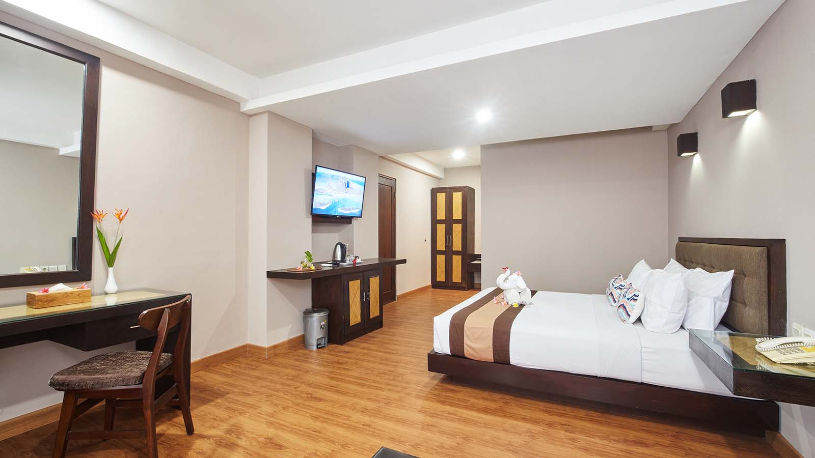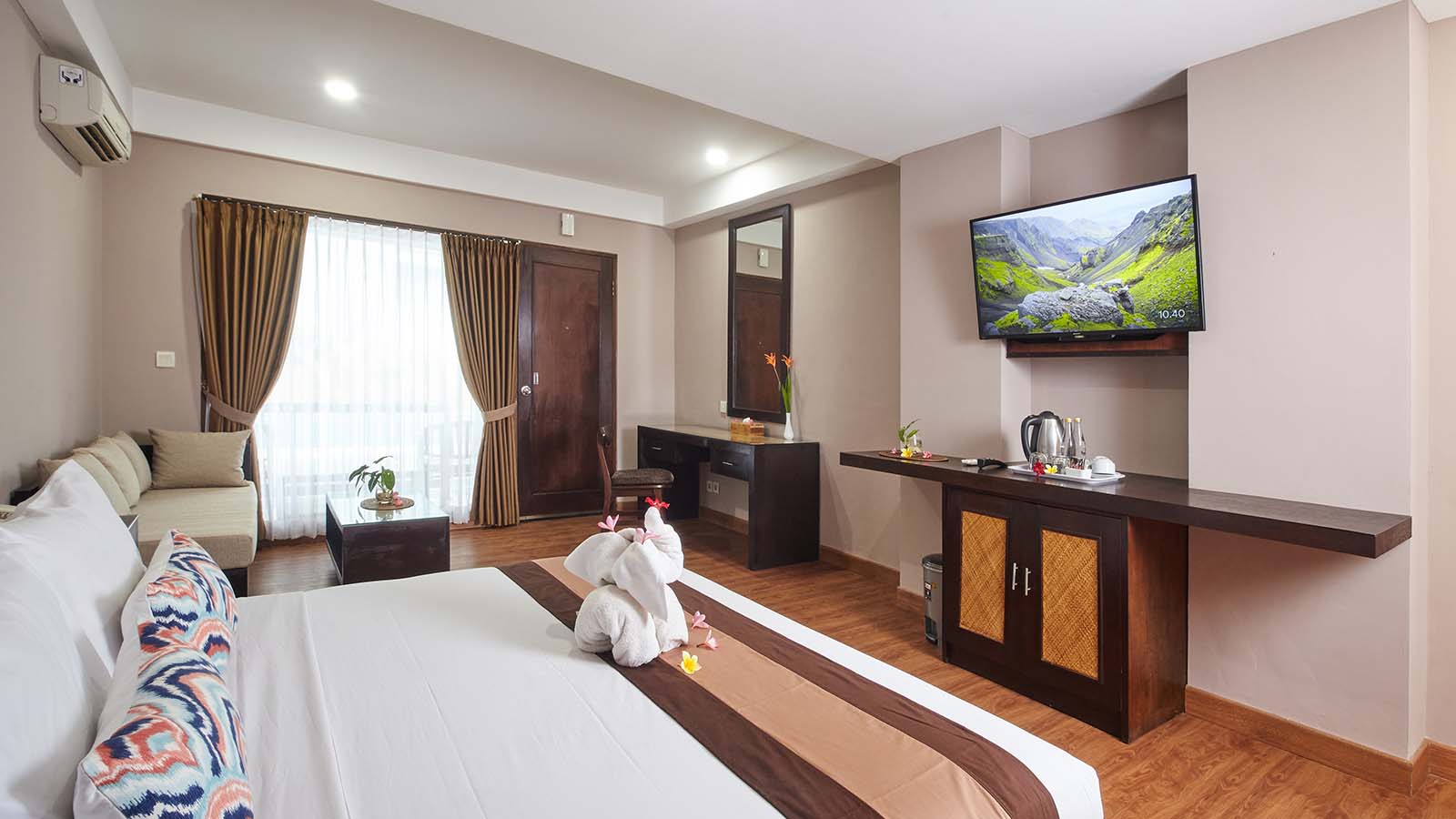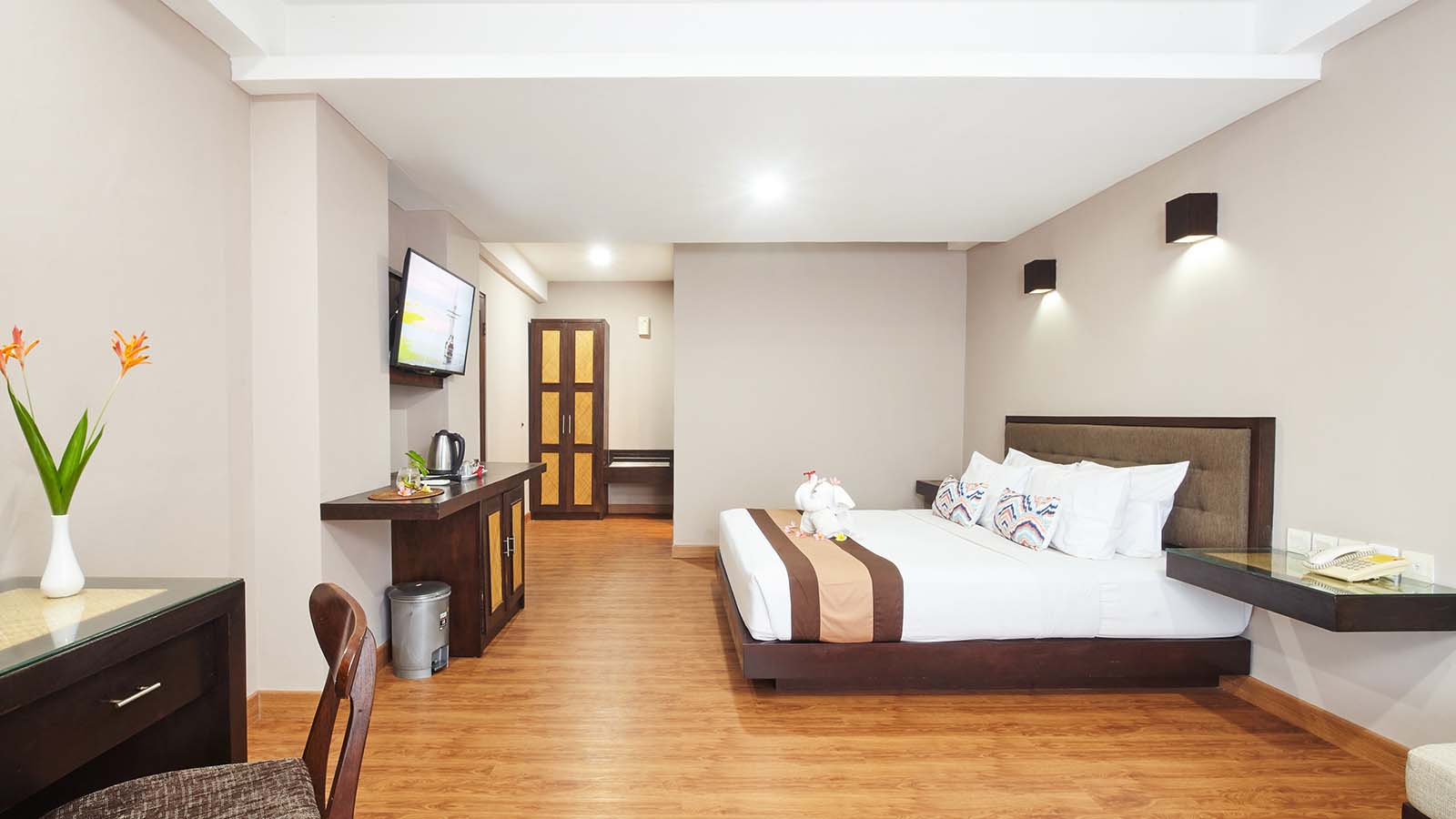 Junior Suite menawarkan lebih banyak ruang dan kenyamanan ekstra bagi mereka yang mencari masa inap yang tenang dan mewah. Kamar ini dilengkapi tempat tidur queen yang nyaman, area tempat duduk untuk bersantai, balkon pribadi dengan pemandangan kota atau kolam renang, serta fasilitas lengkap seperti AC, TV layar datar, Wi-Fi gratis, kulkas, dan pembuat teh/kopi. Kamar mandi modern dengan bathtub atau shower dan perlengkapan mandi lengkap memastikan masa inap yang nyaman.