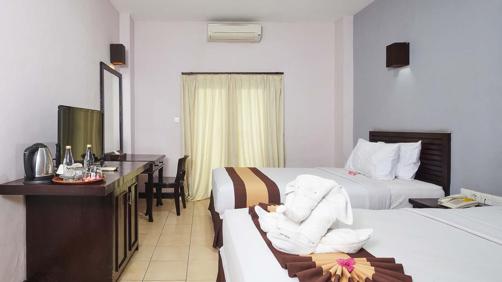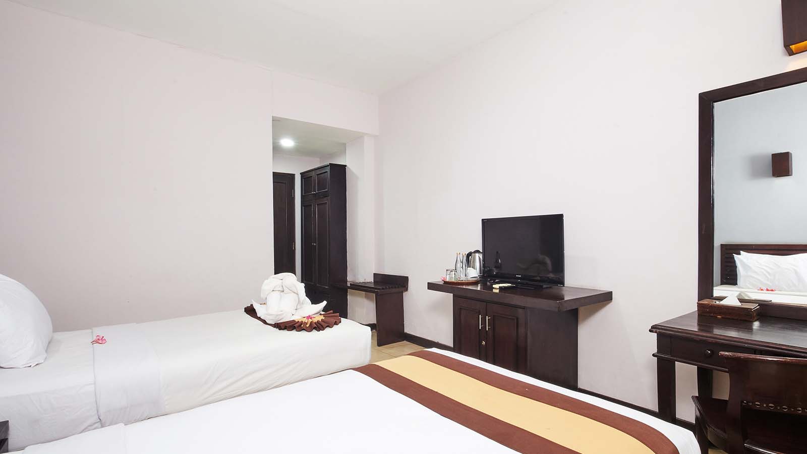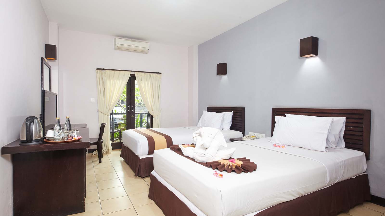 Nikmati perpaduan sempurna antara pesona Bali dan kenyamanan modern di Kamar Deluxe kami. Dirancang untuk pelancong bisnis maupun rekreasi, kamar yang luas ini dilengkapi tempat tidur queen atau twin yang nyaman, meja kerja khusus, dan balkon pribadi yang menghadap ke kota atau area kolam renang. Nikmati fasilitas seperti Wi-Fi berkecepatan tinggi, TV layar datar, kulkas mini, dan kamar mandi modern dengan shower air panas dan dingin.